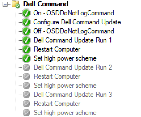 cmd.exe /c start /wait "" "c:\Program Files (x86)\Dell\CommandUpdate\dcu-cli.exe" /applyUpdates -updateType=bios,firmware,driver,others -reboot=disable -autoSuspendBitLocker=enable -outputLog=c:\temp\OSDdcu.log -forceupdate=enableThe other Dell Command Update run steps, just run the same command as above to check for more drivers that might be required. The only difference is that the output log file has its own name per run.